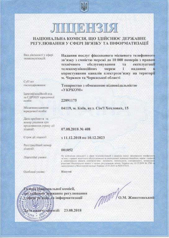 Ліцензія (реєстраційний номер 001052) від 23.08.2017р.