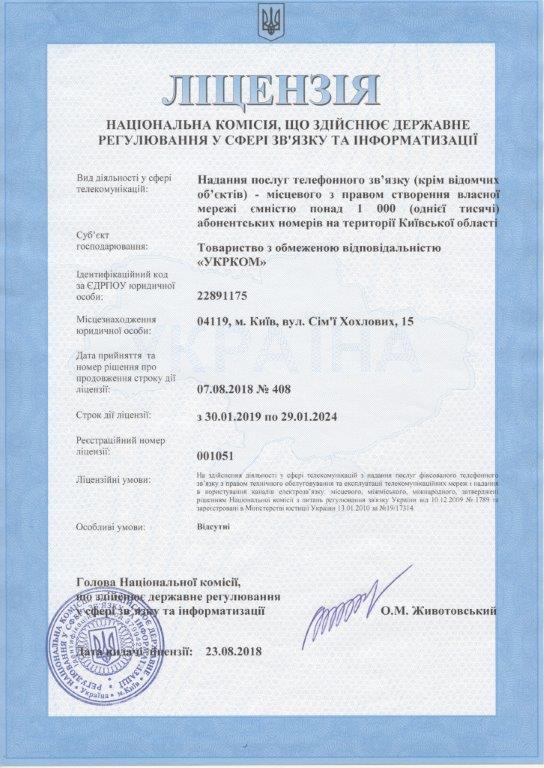 Ліцензія (реєстраційний номер 001051) від 07.08.2018р.