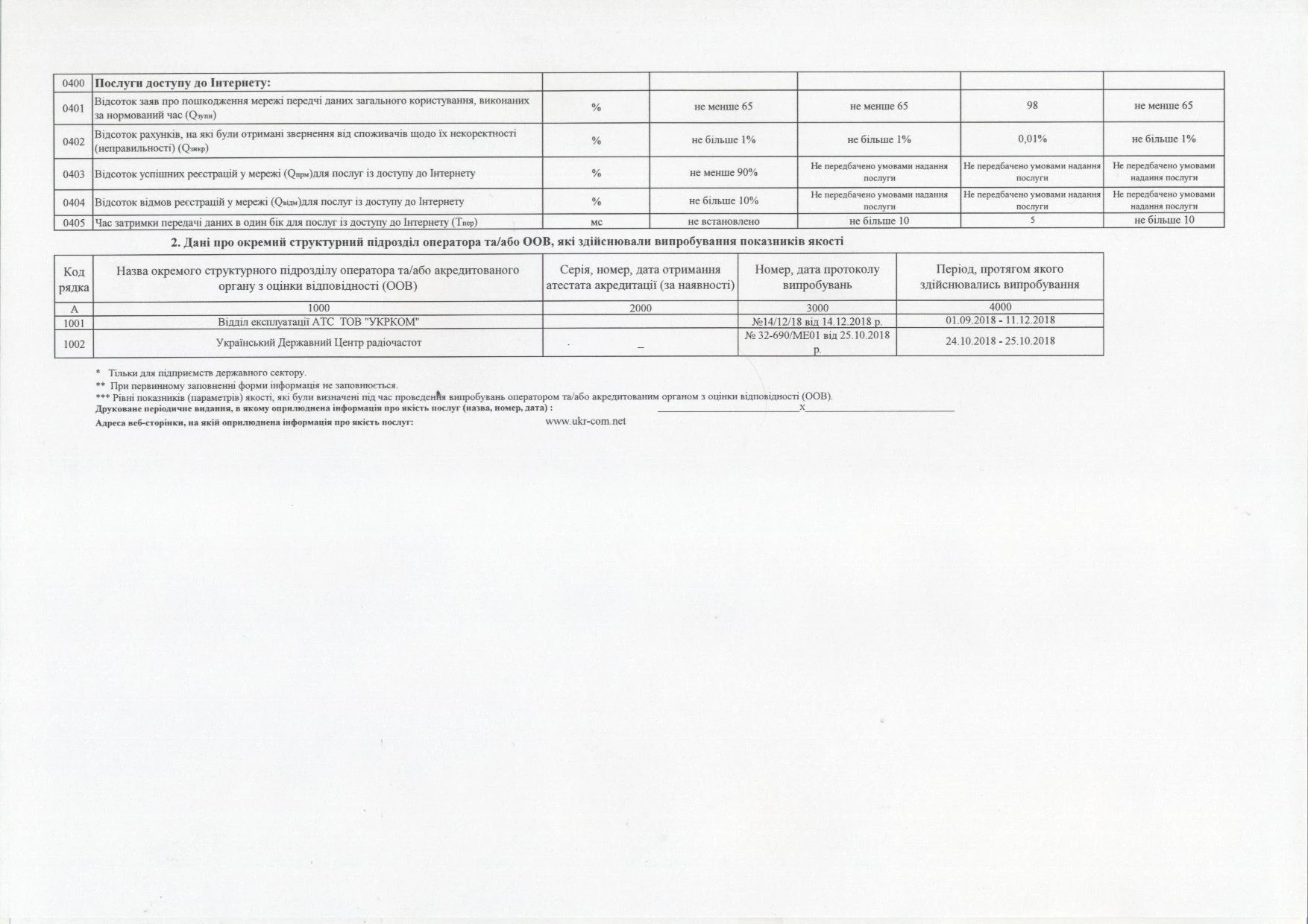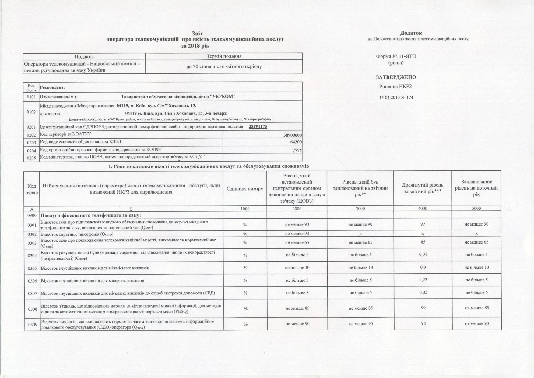 Рівні показників якості телекомунікаційних послуг та обслуговування споживачів за 2018 р.