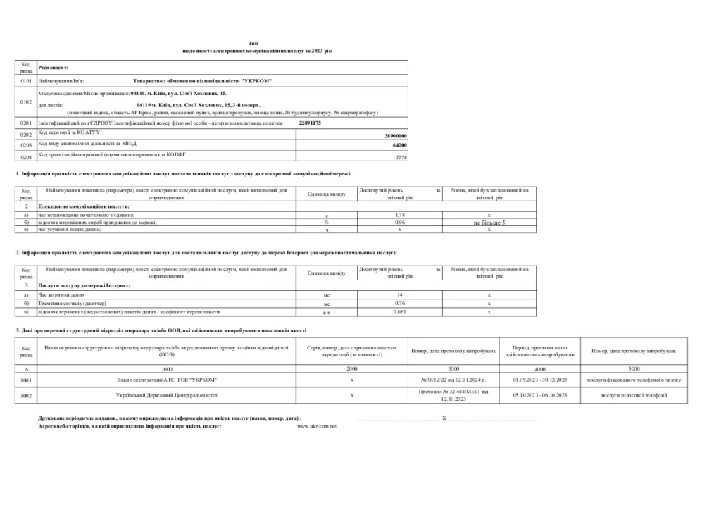 Рівні показників якості телекомунікаційних послуг та обслуговування споживачів за 2023 р.
